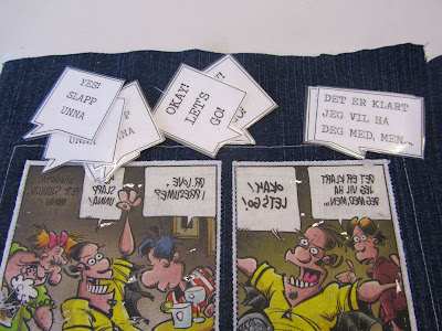 Her er det laget et bilde med Pondus med rammelim. Bildet blir speilvendt ved trykk, slik at snakkeboblene må lages med en ny vri. De er laminerte, og skal monteres i flere lag